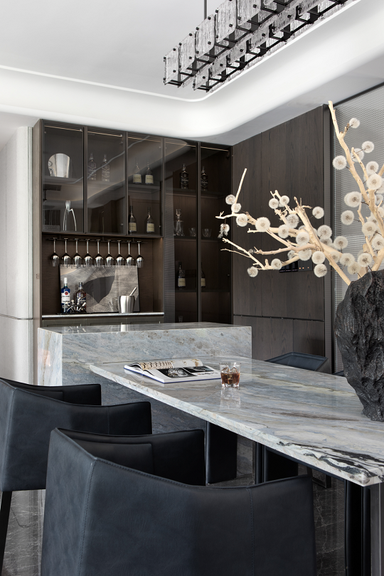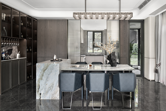 优雅精致的格调延续至餐厅,与开放式厨房布局一体,整个空间用灰加蓝白色呈现出沉稳而不失气场的质感,搭配复古吊灯,更显精致典雅。