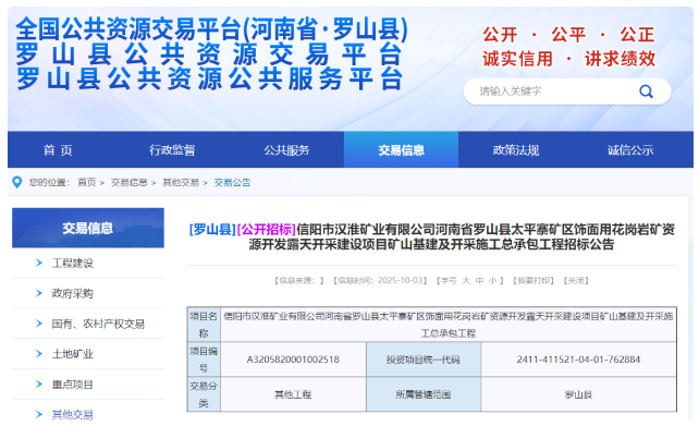 近日,河南信阳罗山县公共资源公共服务平台发布信阳市汉淮矿业有限公司河南省罗山县太平寨矿区饰面用花岗岩矿资源开发露天开采建设项目矿山基建及开采施工总承包工程招标公告。