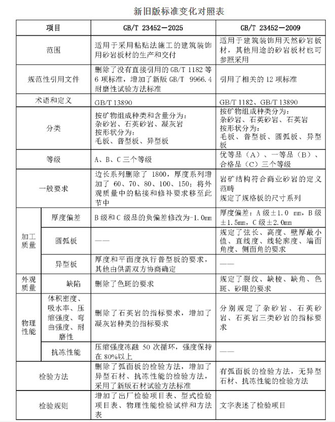 新版《天然砂岩建筑板材》标准在矿物分类中删除了石英岩的类别,该类石材品种有限,新版GB/T 13890将其划分到花岗石类别中。根据石材应用中出现的一类黑色带孔洞的石材品种(市场常称为黑洞石),其各项性能属于砂岩类别,因此增加了“凝灰岩”一类砂岩,与保留的杂砂岩和石英砂岩一起,继续分为三类。增加了类别代码,用砂岩种类的“Q”为首字母,分别加汉语拼音首字母“Z”、“S”、“N”,组成两位字母的种类代号。删除了形状分类中弧面板的分类,原因是该类产品应用在柱面装饰,基本采用干挂法施工,不在本标准的范畴。等级分类中取消了优等品、一等品、合格品的叫法,保留了A级、B级、C级的分类,符合行业的分类习惯。